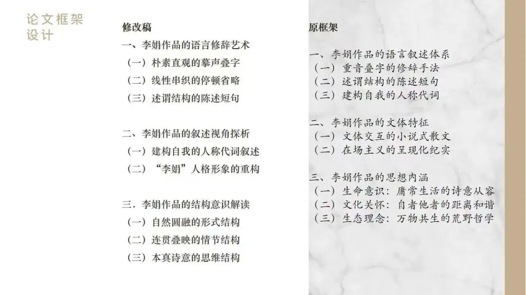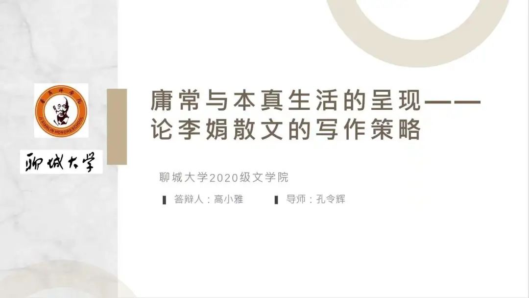 文科班高小雅同学的论文题目是《庸常与本真生活的呈现——论李娟散文的写作策略》,她在答辩时重点介绍了自己的论文内容框架和完成进度,并在开题报告后根据导师们的意见进行了一些调整。一是在导师的指导下将题目进行了变更,使其更加突显研究目的和意义,二是对论文框架进行了修改和完善,改进为从修辞,叙述视角和结构三个方面来研究李娟散文的写作形式,提高了逻辑性和完整性。根据现在的写作进度,她提出了自己遇到的技术难题,主要是在文献搜集途径受限和写作的逻辑性、严密性方面,同时依次提出了自己的下一步工作计划,以求将自己的论文进一步得到完善。