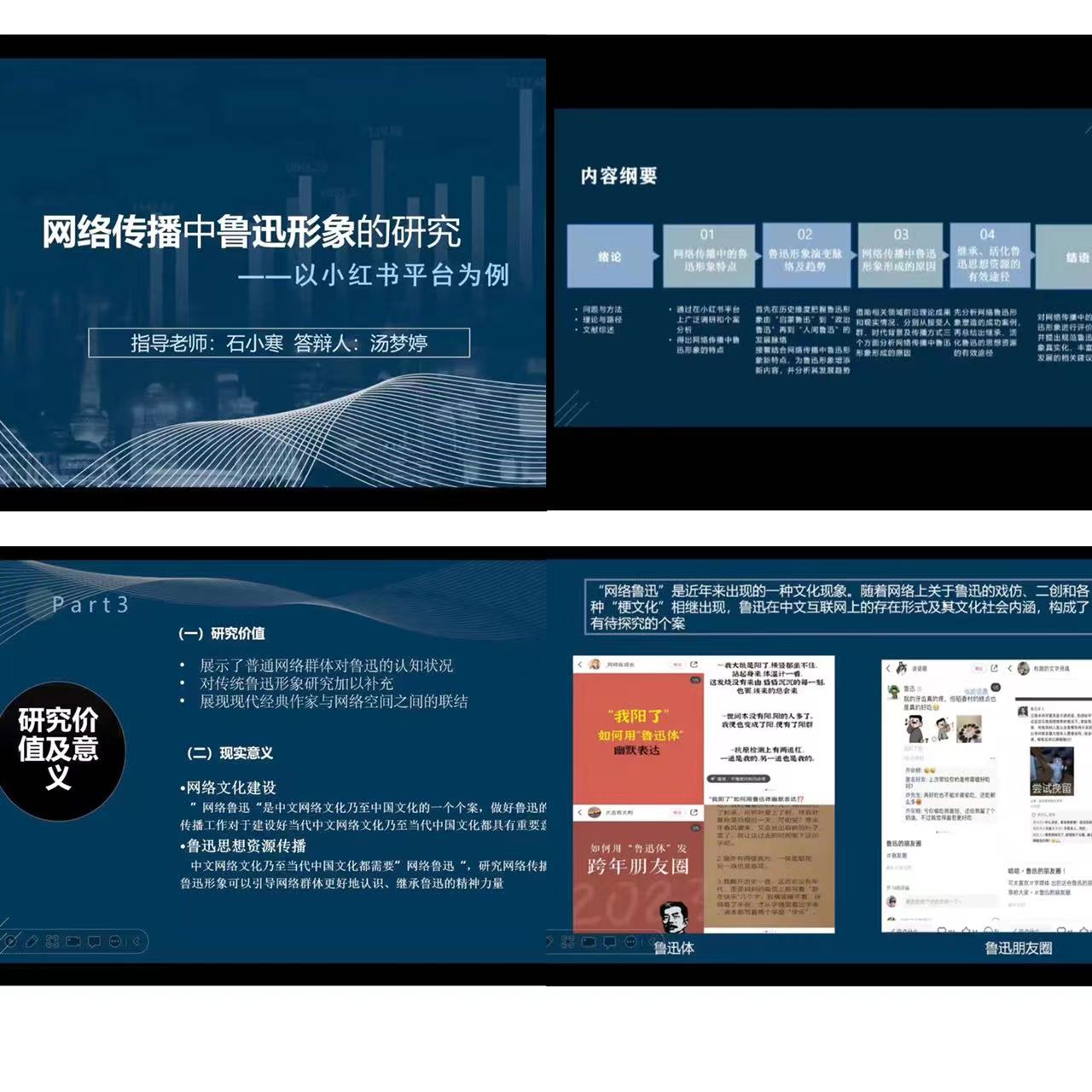 文科班汤梦婷同学的论文题目是《网络传播中鲁迅形象的研究——以小红书平台为例》,她介绍了自己论文的研究目的和论文框架。针对"网络鲁迅”这一近年来出现的文化现象,以小红书平台为例,运用亲身参与观察法、调查分析法和个案研究法,依托西方文化研究中的大众文化理论,来探讨网络传播中鲁迅形象的特点、发展趋势和形成原因,并以此为基础指出活化鲁迅思想资源的有效途径。