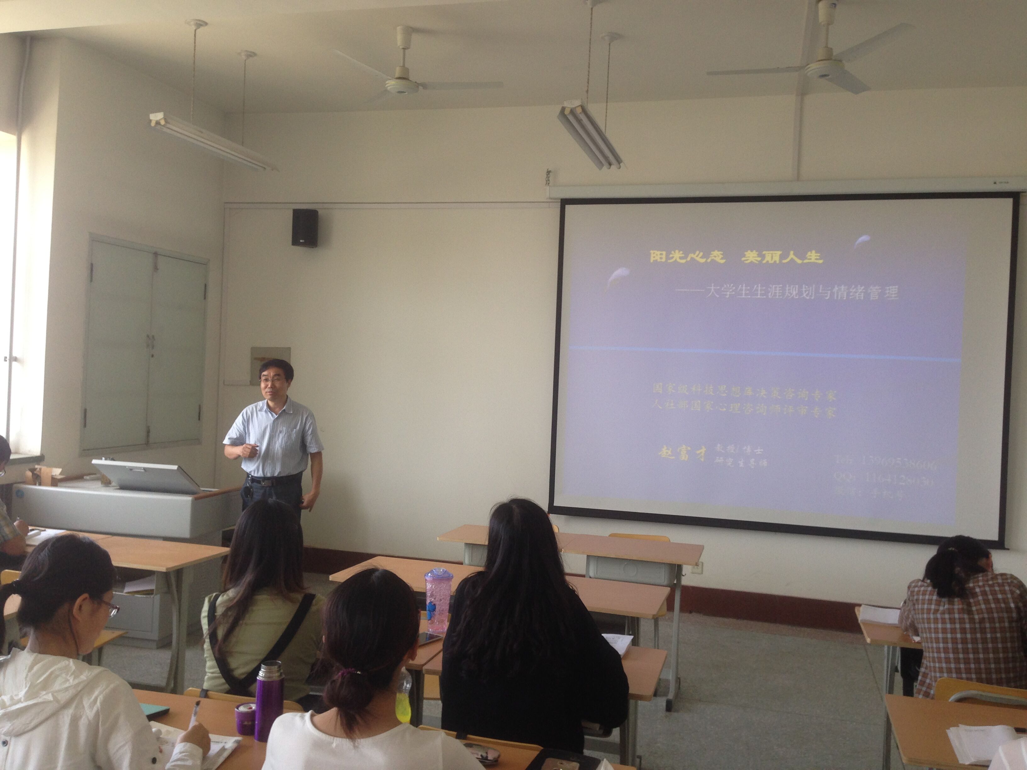 讲堂伊始,赵教授以半杯水反映的积极心态与消极心态的事例提出自身正能量的重要性,要平衡心情善于倾听,打开心灵的窗户。在第二部分赵教授为大家具体展开了职业生涯规划相关内容,规划要依据社会变化、需求变化、个人心理不断调整;规划要有顺序和对风险要有良好的认知判断;规划需要有良好的阳光心态。赵教授用专业学科知识科学的谈到了职业生涯规划各个组成部分,科学的评估和计划执行。第三部分谈到了热爱生命的生活才美丽,具体讲到了人生的天平理论。最后一部分则是塑造阳光心态,重视过程和享受过程,拥有阳光的心态才能拥有更美好的生活,同时谈到了怎样更好地塑造阳光心态。