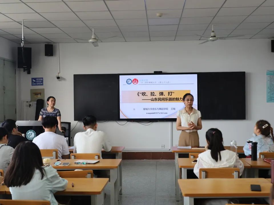 民间艺术是活跃在民间生活中的艺术因子,时刻闪现着人类的智慧之光。山东民间艺术种类丰富,形式多样,在历史发展进程中,一直是满足人类审美需求、丰富艺术生活、抚慰心灵的重要因素。王敏分别从吹、拉、弹、打四个方面讲解山东的民间乐器,为同学们带来了一场音乐盛宴。