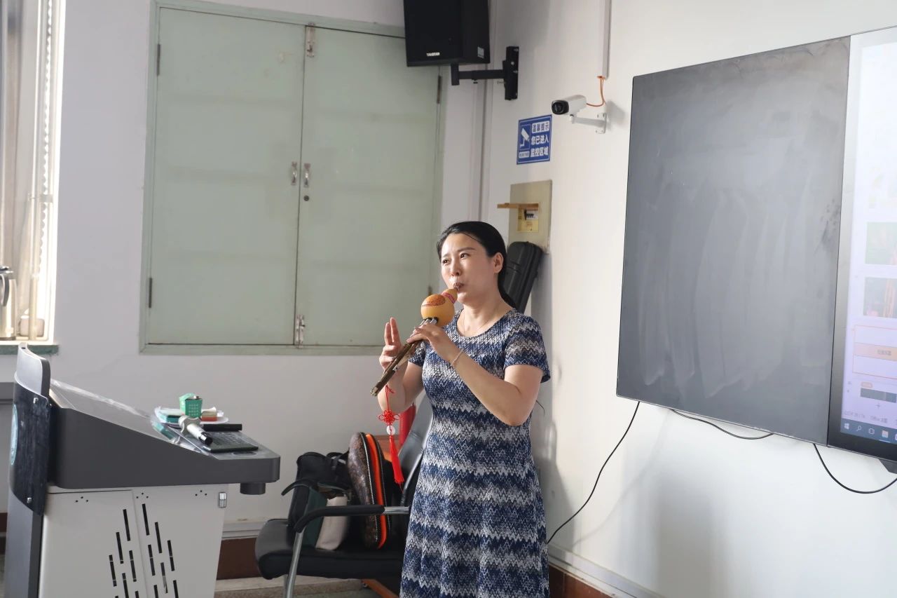 “吹”是指吹管乐器,包括笛子、萧、唢呐等。王敏为大家介绍了聊城地区的特色民间吹管乐器—尺八,《旧唐书·吕才传》记载,尺八是吕才根据其管长一尺八寸合黄钟律而定名的乐器。唐宋时传至日本,宋以后因文化断层等原因在我国逐渐失传,而在日本却发展成为国宝级乐器。王敏为大家讲解了音乐与舞蹈公司刘哲老师研究尺八的努力和贡献,带领大家一同欣赏了刘哲老师创作的乐曲《归》,乐声中蕴含的对于民族文化的独特情感令大家感动。接着分别带领大家了解并欣赏了阳谷泥哨、埙等吹管乐器,王敏还亲自为大家带来了葫芦丝演奏,同学们都沉浸在悠扬的旋律中。