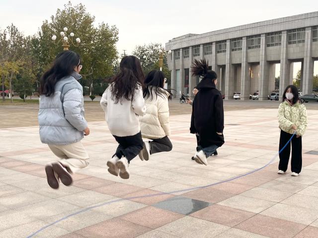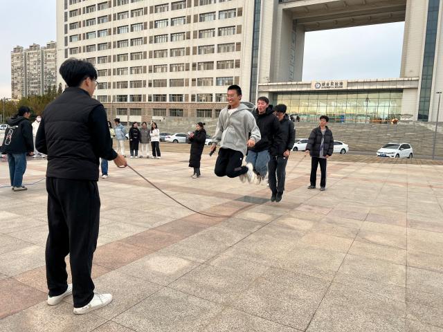 拔河比赛落下帷幕的同时另一场比赛悄然展开,红色跑道上腾空而起的身影正是跳大绳的同学们努力拼搏的生动写照。轻轻地,同学们飞过这长绳,似燕,似风,似箭,仿佛星光,即闪即现。随着计时器“咔哒”一声,有趣的跳绳比赛正式开始。同学们眼睛注视着长绳落下的时机,脚下蓄力准备跃起,还注意着与其他同学的配合,一次次落体运动在长绳下完成。随着一声声同学们脚掌落地的声音,长长的红色跳绳在天空划出一条条弧线,弧线组成一个圆,同学们圆满完成了跳大绳的比赛,大家的心也紧紧地团结在一起。