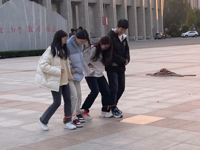 最后,考验默契的四人五足上场。面对两人三足的升级版,同学们毫不畏惧,开始前同学们抓紧时间讨论战略战术,进行比赛前的练习。比赛正式拉开帷幕,参赛的同学们齐心协力,相互配合,齐喊口号,掌握节奏,向着胜利的终点飞奔。