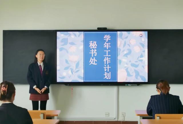 领略了主席团的精彩之后,曹雨阳为我们展示了秘书处学年工作计划,曹雨阳以简洁凝炼的言语阐述了秘书处的基本工作,包括考勤、活动筹备和收尾、后勤保障等,逐一列出了每一部分的具体要求,做到了面面俱到。
