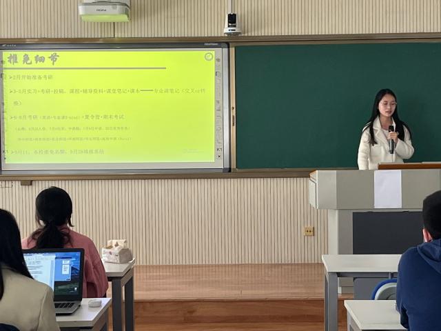分享会上,熊猫体育2018级获得推免资格的十四名优秀员工代表依次上台分享交流,他们将个人丰富的推免经验整合汇总,为学弟学妹们提供了宝贵的经验借鉴。在文科班分享交流会中,颜培森详细介绍了保研制度和相关文件政策,结合个人学习情况和获奖经历展开分享,基于学习成绩、科研竞赛、科研成果、员工工作等方面对夏令营和预推免进行了详细介绍。周敏则分享了自己的学习方法,介绍了推免流程和相关材料准备,建议同学们要善于利用相关平台的学习资料:同时做好心理建设,做到拿得起、放得下、想得开,帮助自己更好地进行准备。孟盈竹介绍了夏令营、预推免、九推流程等内容,分享了自己保研的前期准备和实战经验,她告诉同学们保研是一场“心理战”,要做到考研、保研双管齐下,最后祝愿大家能够一战成硕。
