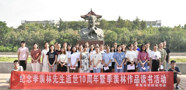 清晨,新鲜的阳光轻轻洒在羡林湖上,此时的晨风还带着夜的微凉和静谧。羡林湖边,季羡林先生石像下,一阵读书声悠悠扬扬的飘荡起来。一群青年,怀着对文化的尊崇和对大师的敬缅,郎朗书声为祭,遥寄一片怀念。