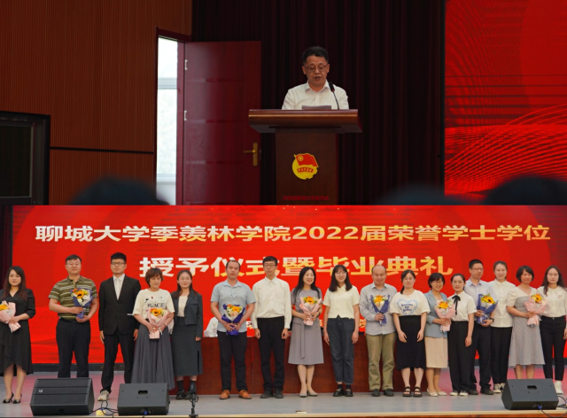 饮水思源,砥砺前行。羡林学子所取得的成绩与其指导教师、任课教师的培养不可分割。为此,羡林学子特为导师和授课教师代表献花,并真诚地向诸位老师表示感谢。建筑工程公司孟昭博教授作为导师代表发言,他表示,羡林学子以优异的成绩毕业,践行了季羡林先生赋予聊大“敬业、博学、求实、创新”的校训;他希望同学们志存高远、理想远大,爱岗敬业、坚持守望,博学笃行、求实创新,诚实守信、脚踏实地,勇做走在时代前面的奋进者、开拓者、奉献者。