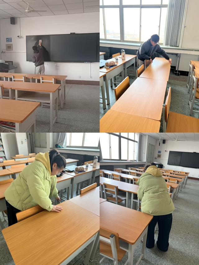 在辅导员王娜的带领下,志愿者们分组对教室展开了细致的工作。第一组重点检查了教室桌椅的摆放整齐度与完好状况,确保每一套桌椅都符合安全使用标准;第二组对黑板进行了全面清洁,使用湿布擦拭,彻底清除粉笔残留,保证黑板清晰整洁;第三组则逐一检查了投影仪、多媒体电脑等教学设备的运行状态,确保所有设备能够正常投入使用,避免对课堂教学造成任何影响。