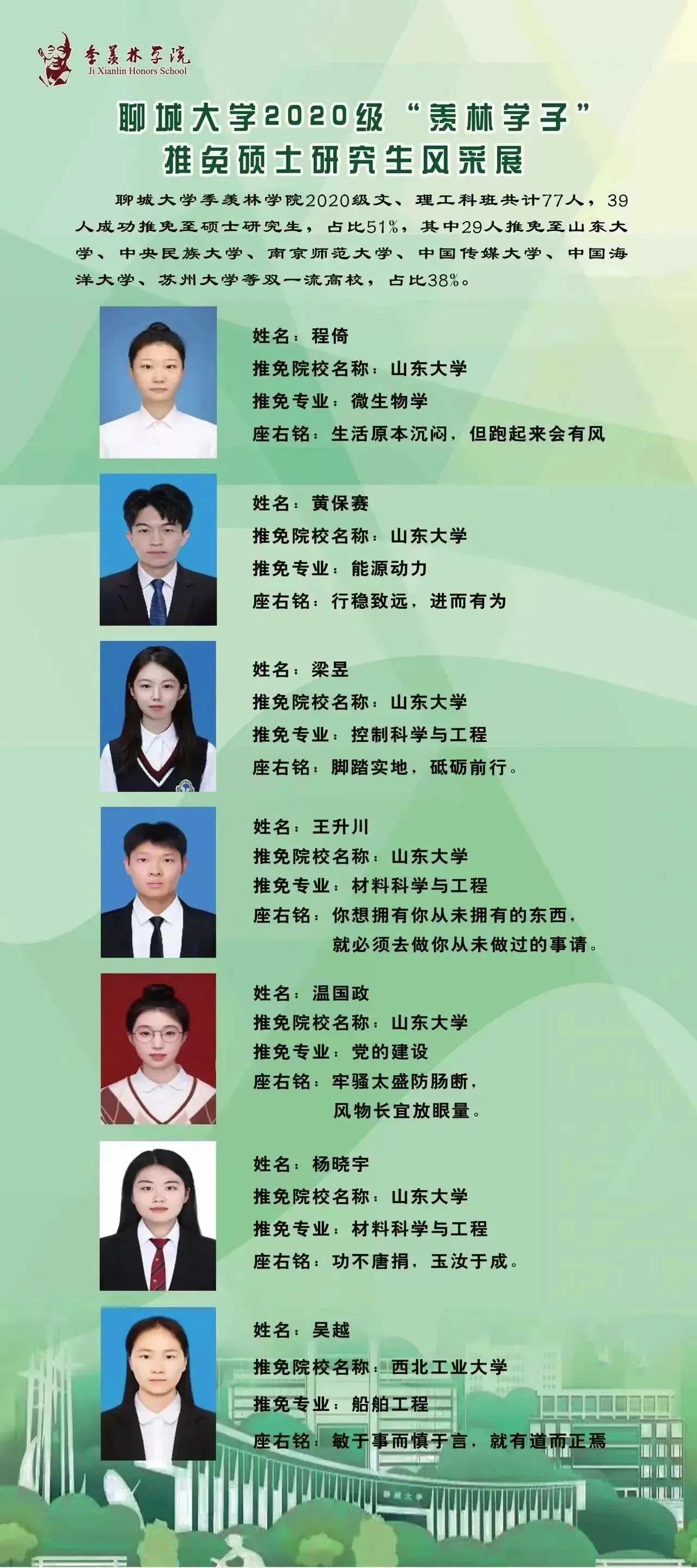 熊猫体育2020级文、理工科班共计77人,在2024年硕士研究生推免中39人成功推免,占比51%,其中29人推免至山东大学、中央民族大学、南京师范大学、中国传媒大学、中国海洋大学、苏州大学等双一流高校,占比38%。
